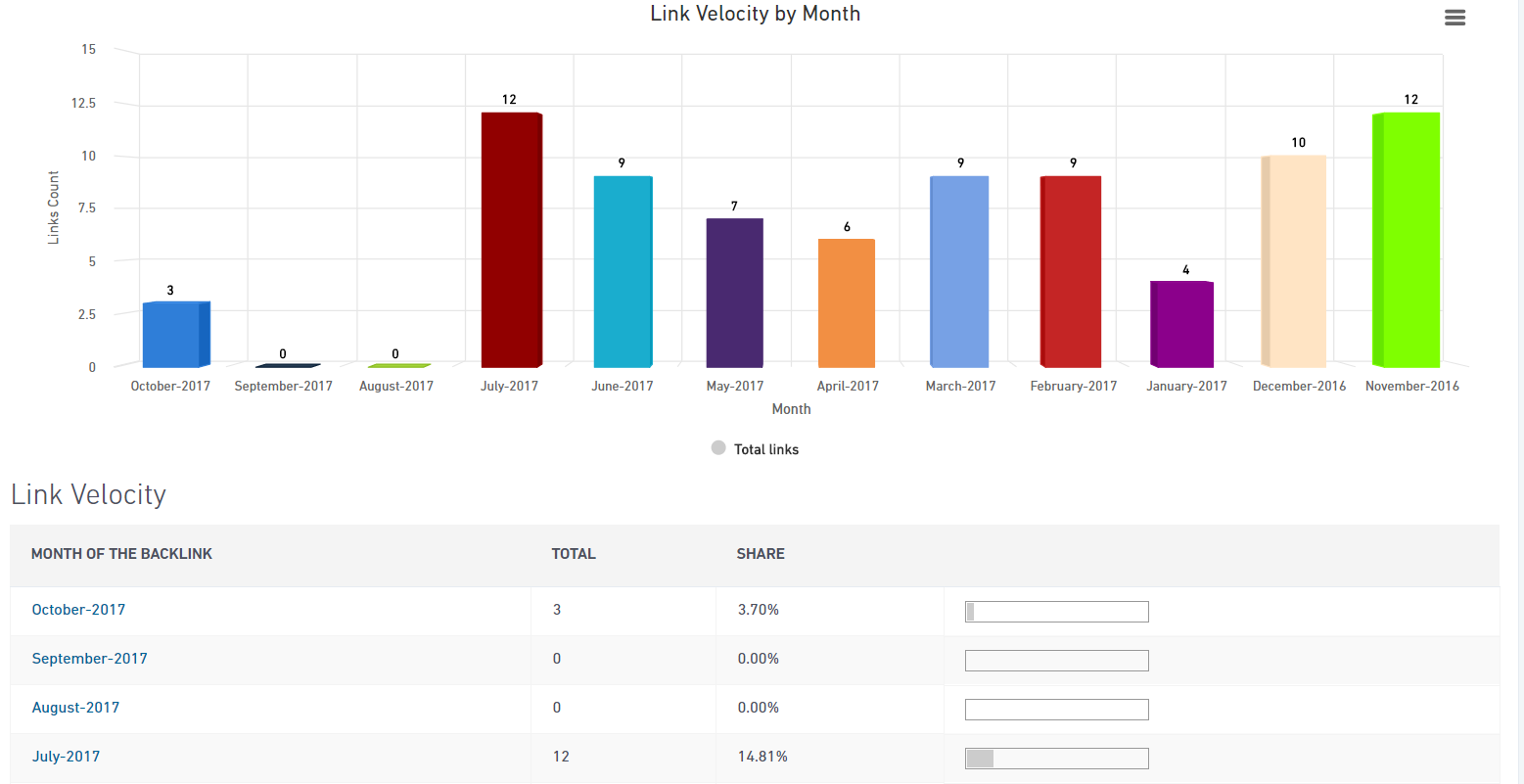 Another important part of the Site Explorer is the Link Velocity. This shows you how many links you have for each month which helps you with your link building strategy. The Site Explorer is your quick access tool which would help you get a quick look at how your SEO campaign is doing.