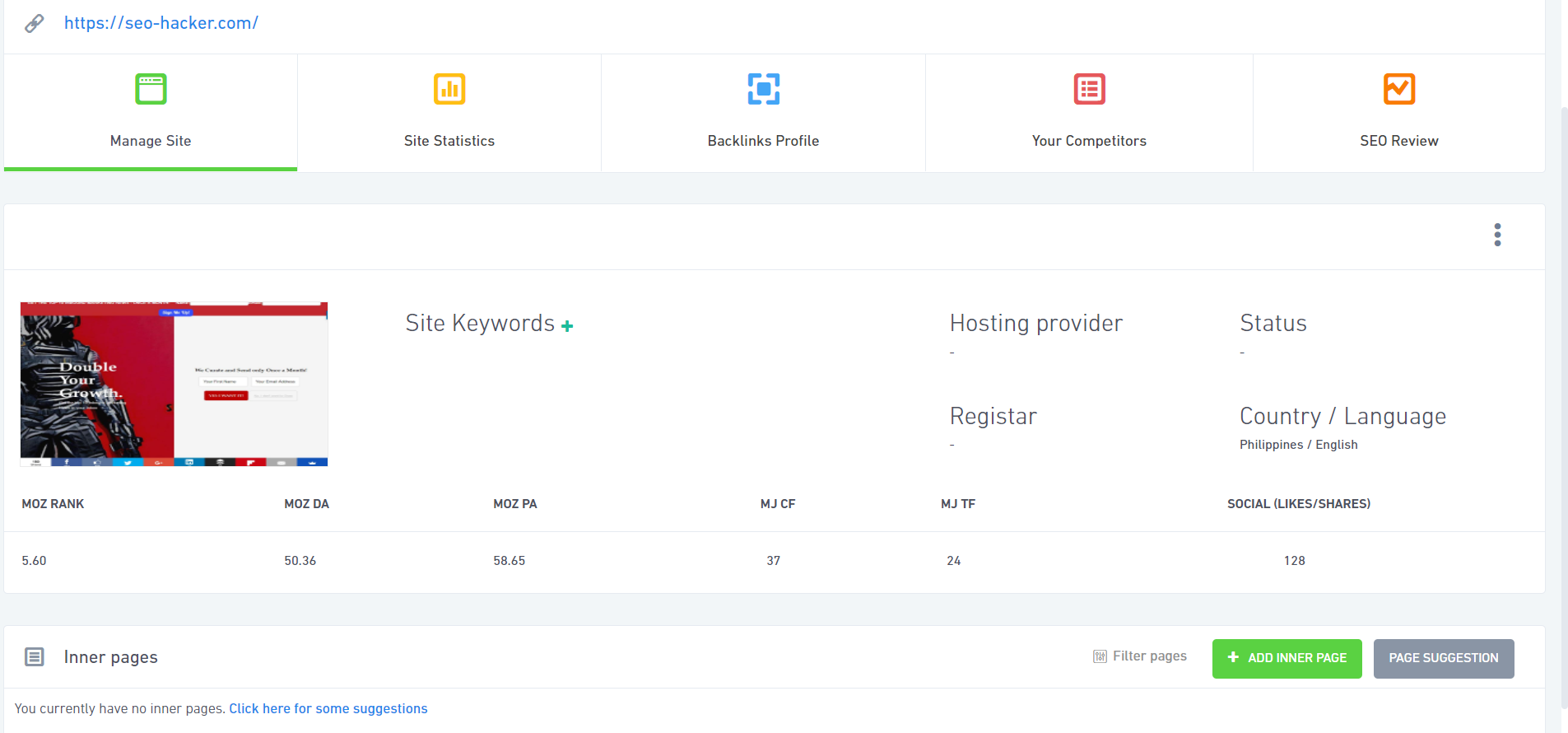 Upon entering the Site Management page, you can instantly see all of the projects that you currently have, along with some information like IP address, Domain and Page Authority, Moz Rank, Backlinks, and Social Metrics. You can also sort each of your projects by alphabet, or by their metrics and SEO rankings.