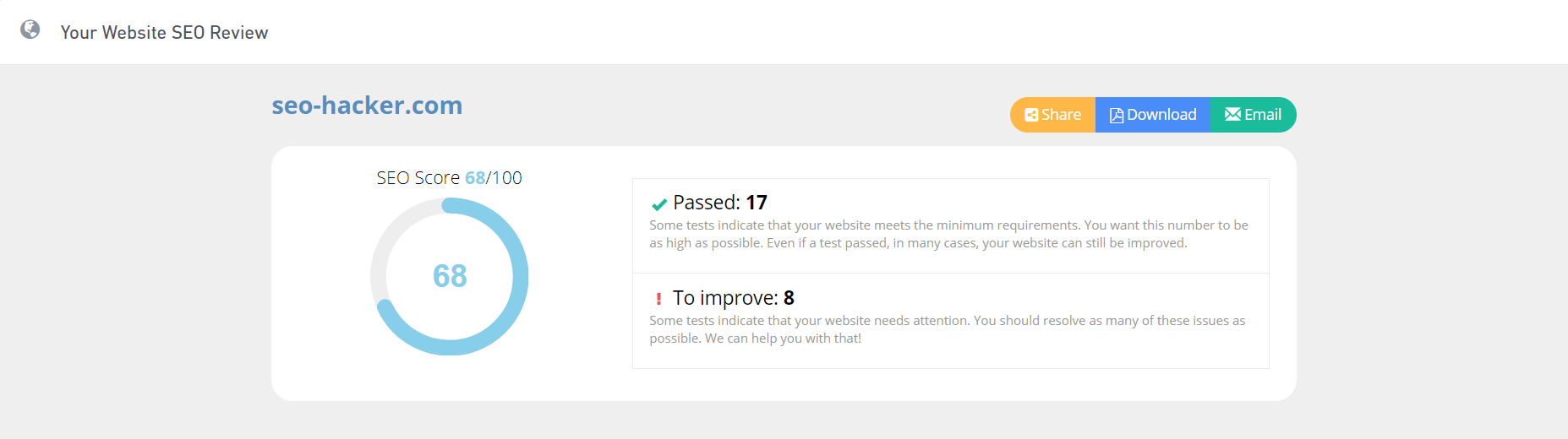 The SEO Review tab is basically a detailed, yet concise report of your project. This would help assess the steps you need to take your SEO campaign further, as you are able to look for those specific details that would help you improve.