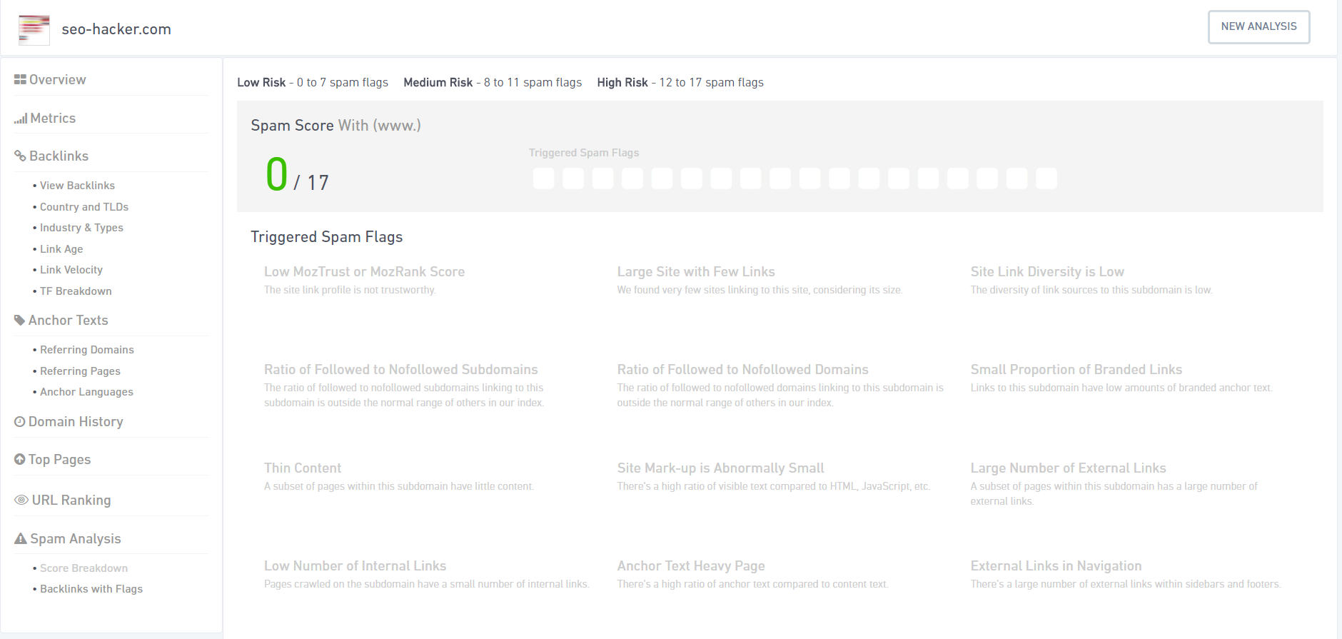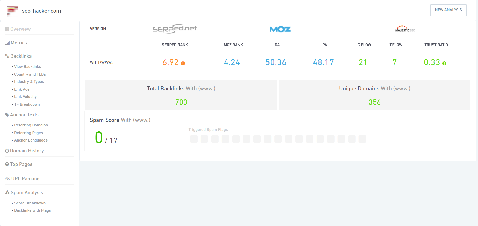 Once you enter a domain, you get an overview of the domain, along with other relevant statistics. The sidebar on the left helps you access these data without the need of having to scroll down the whole page. Along with this, Spam Analysis has also been added, which helps eliminate unnecessary links and help evaluate potential links.
