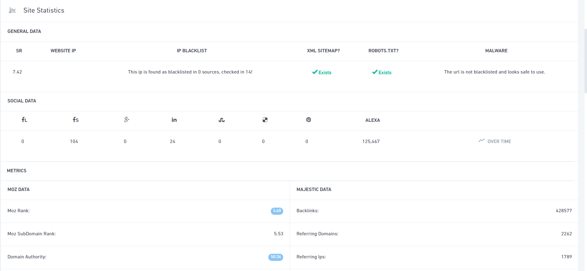 On the Site Statistics tab, you get a very comprehensive list of data, which include keyword search volume, Moz and Majestic data, and keyword count and density.