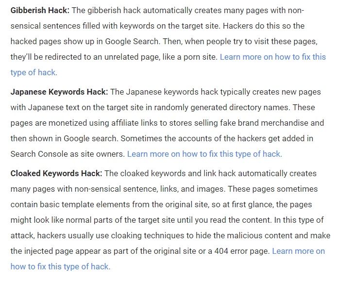 Google expressed their sincerity in helping Web Masters with their security issues and they proved it by creating documentation that would provide more context for when a website is attacked or compromised. Here’s Google’s list: