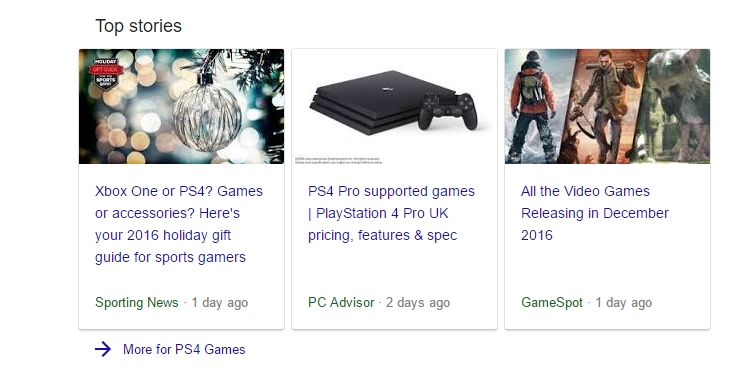 I used the search term “PS4 Games” and lo and behold, here are the featured content for Top Stories. What immediately caught my eye is PC Advisor’s article on PS4 Pro’s pricing, features and specs. Normally speaking, PC Advisor wouldn’t be my go-to website if I was looking for news on SEO but in this case, PC Advisor’s featured content is really spot on.