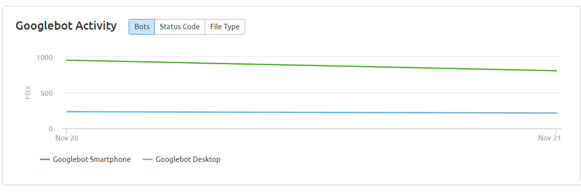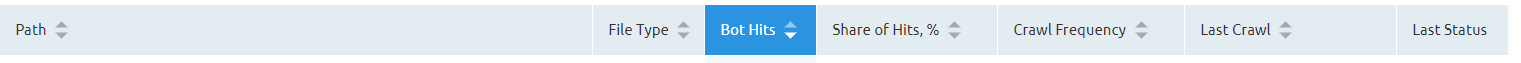 Along with these filter options, you can also sort the data, allowing you to see which pages are being crawled more frequently, the number of bot hits, and even file type and page status.