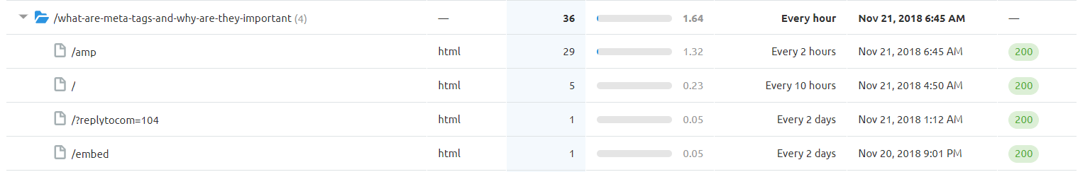 Once you have filtered and sorted out your data, you can view each folder to see crawl statistics. Each folder shows each version of a web page that has been crawled by Google. This comes in handy when it comes to tracking the AMP version of our web pages or tracking the traffic we received using sharing tools.