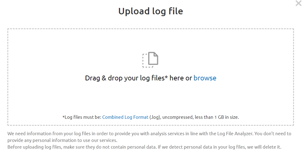 Once you have accessed the Log File Analyzer, you would need a .log file to be able to begin tracking and analyzing data. The processing time depends on the file size, which means it might take a few minutes for larger files.