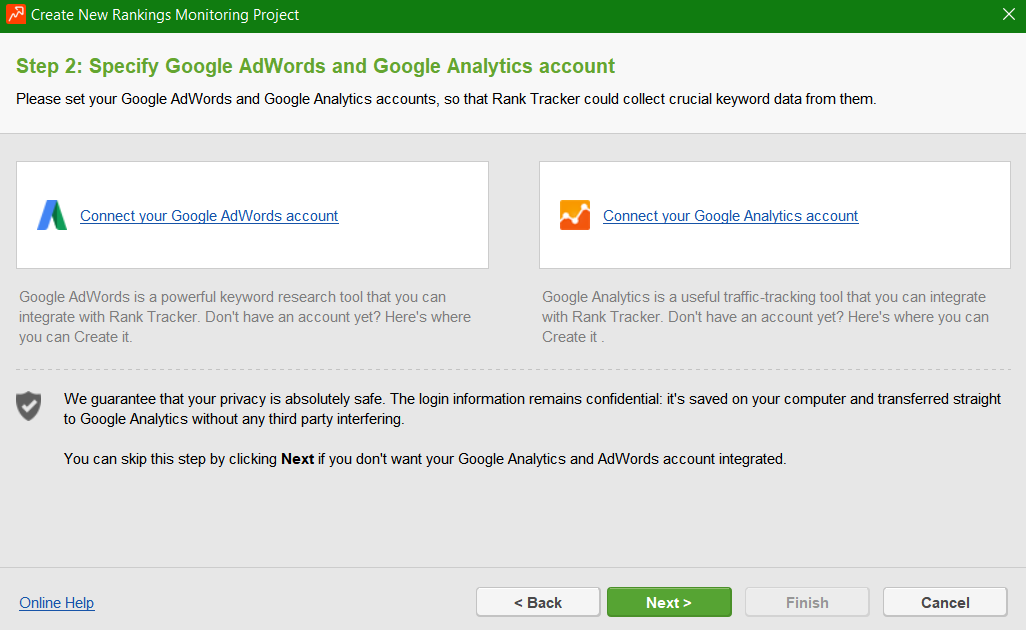 After entering the URL, you can allow Rank Tracker to integrate Google Adwords and Analytics, which comes in handy when wanting to take a look at the traffic the website is receiving.