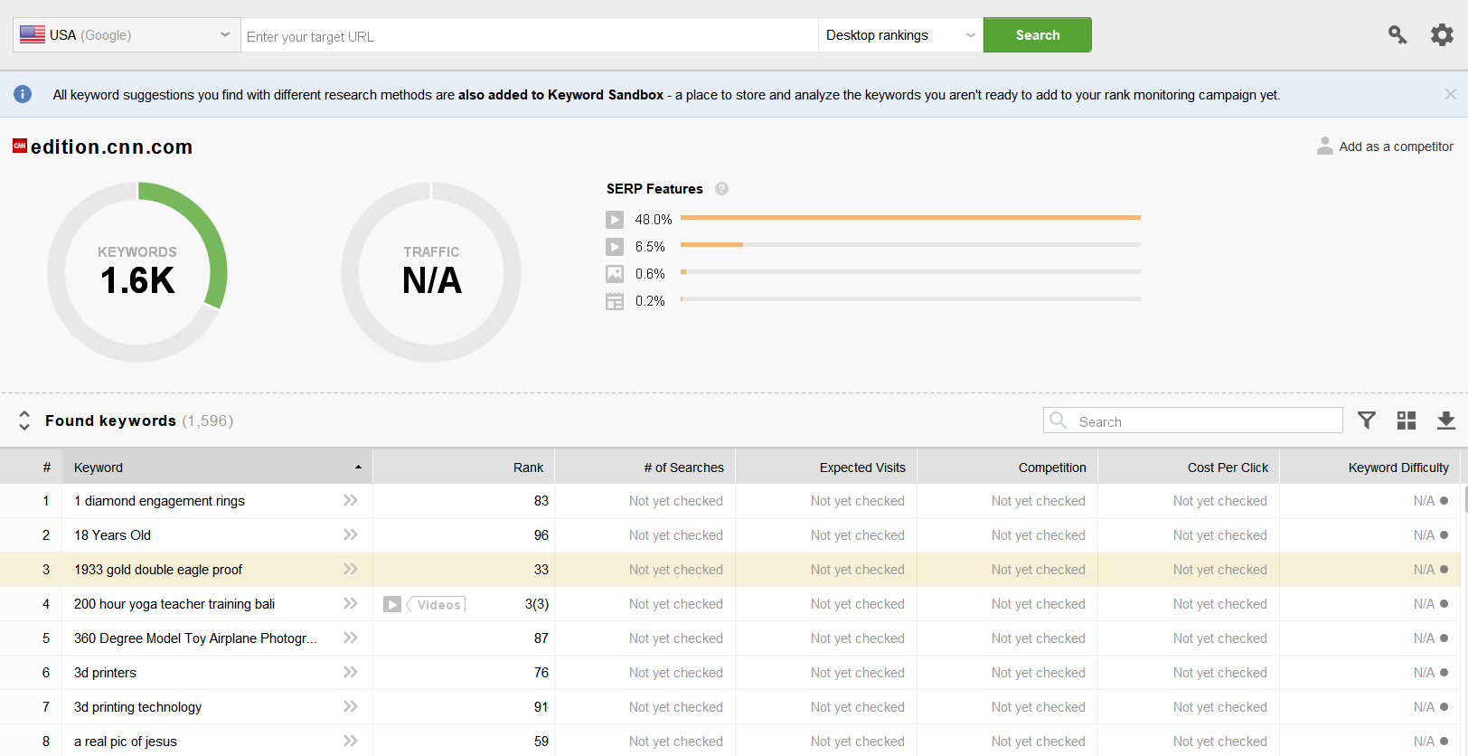 Keyword Research allows you to enter a URL and look for keywords within a certain website. You can also perform a multitude of functions as well, such as related searches, autocomplete tools, and even access a keyword sandbox.