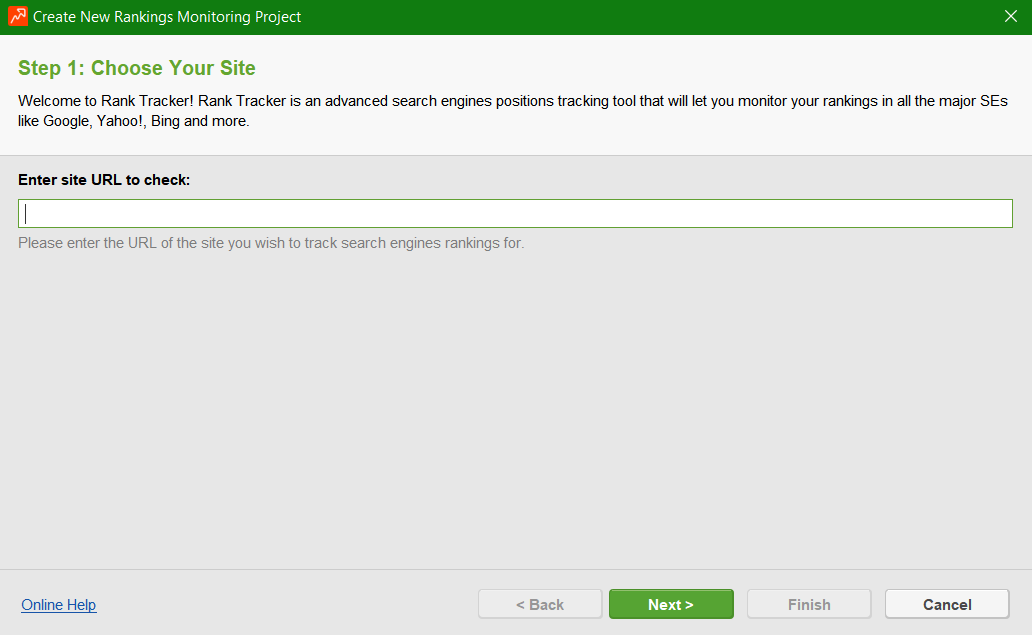 To start tracking keyword rankings, the first step is to begin a new project by entering the URL of the website that you want to track.