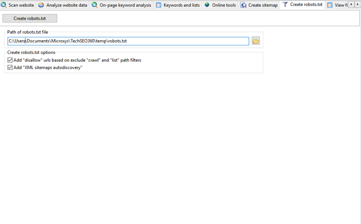 If your site does not have crawlers, which affect the visibility of your website, this tool allows you to create robots for your website to increase the number of crawlers. Creating robots using TechSEO360 is simple and quick, only needing you to create a .txt file, and click one or two of the available options. After creating robots in your site, you can use a Ping Sitemap to monitor your progress.