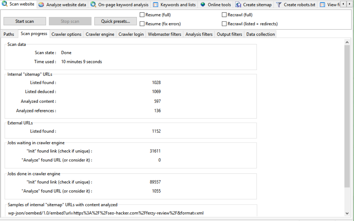 After having our website scanned for 10 minutes, I was able to get a sizeable amount of data with regards to the amount of external and sitemap URLs, and jobs that are present in the crawler engine. The longer you would scan your website, the more crawl data you would be able to obtain, which can help you monitor your leads, traffic, and other information related to your website. After scanning, you can analyze your data further using the analysis tool.