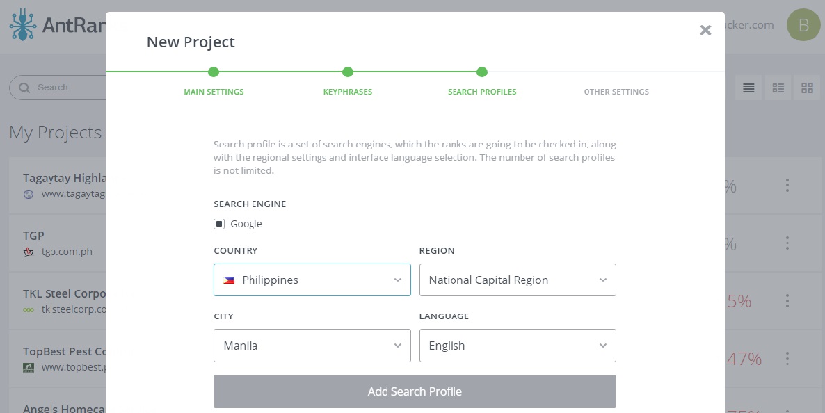 The app also has a search profile feature that allows you to search on a regional setting. This will show if your links were built in another country or if you effectively created traffic in your desired location.