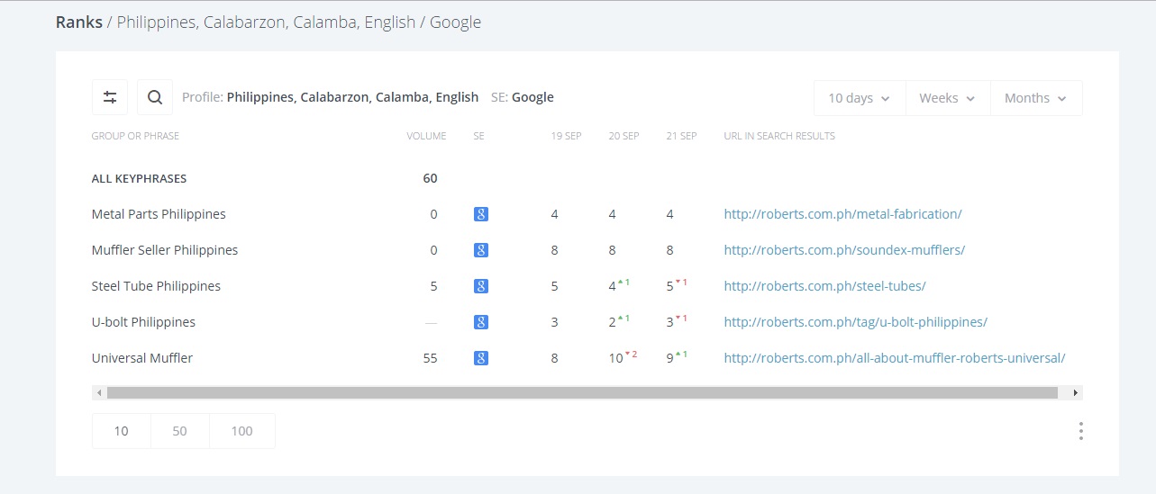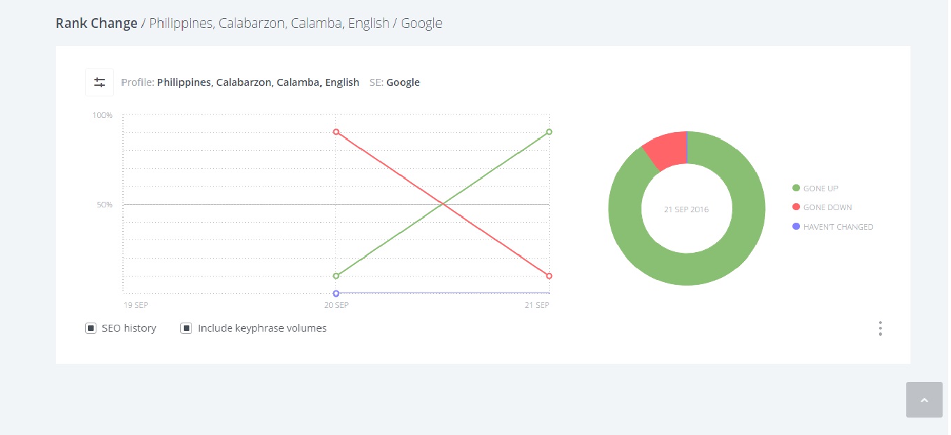 You can see the decline or growth of your keywords’ rankings in a span of ten to thirty days (it depends on your desired setting). As you can see in the picture above, the rankings of two keywords dropped by a point while one keyword increased by one point. In a way, this is a shortcut for SEO research as you don’t need to log in everyday just to get results. Instead, it automatically collects the data on a daily, weekly, or monthly basis.