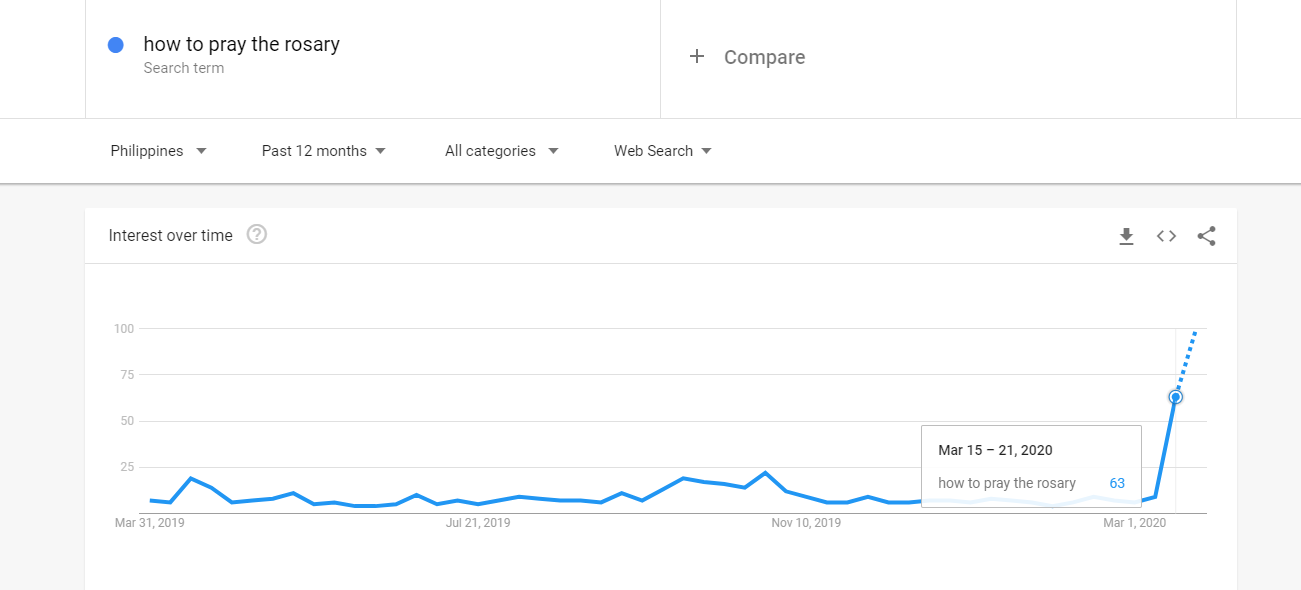 Of course, with the impending risk of disease, prayer should always be a part of the daily routine of the predominantly Catholic country. Since March 15, people have been searching for articles on how to pray the rosary.