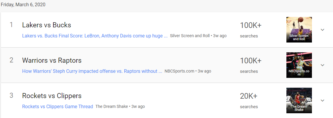 This is a far cry from the search trends during the first week of March since it remained consistent for topics concerning NBA games with Coronavirus related searches as minor players in the trends. Since the pandemic also affected the operations of the NBA, the trending searches for the games came to a halt when they announced that the season is suspended indefinitely due to the virus.