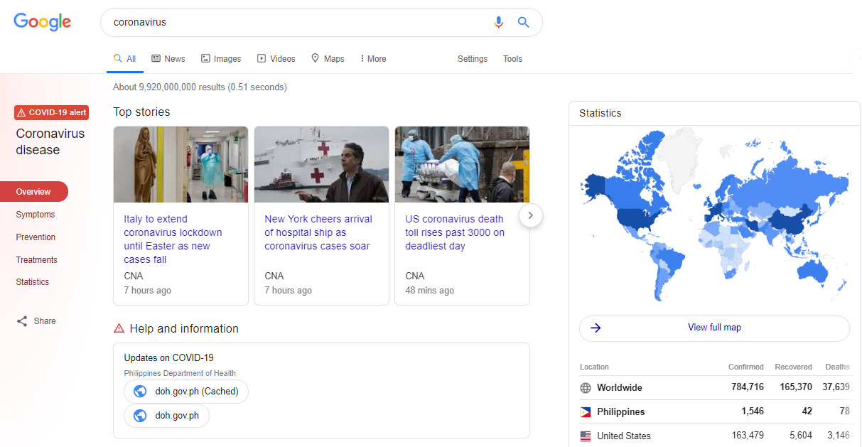 Search results for health queries regarding the virus are dominated by news and government sites with the ever present Wikipedia link of course. One thing that I also noticed is the help and information section tailored-fit for the Philippines with our Health Ministry website links embedded in a snippet. Is this also the same for your country? Let me know in the comments below.