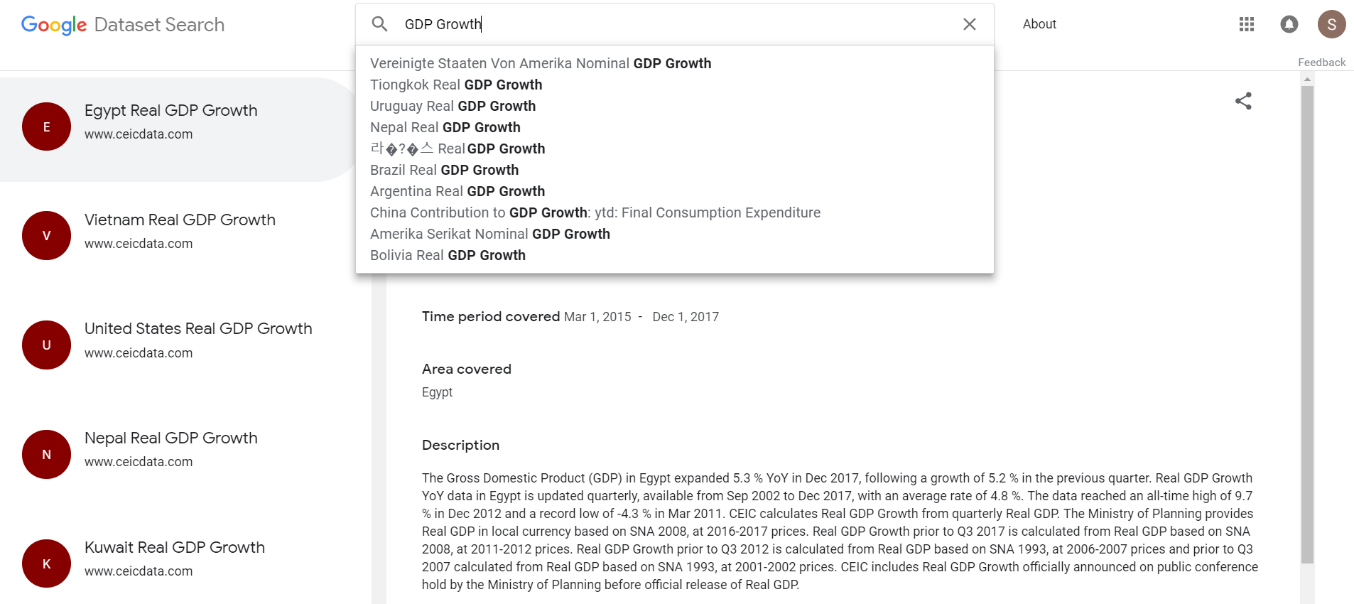 To see how effective the current Dataset Search is, let’s search datasets from different sectors. Let’s start with some international GDP datasets.