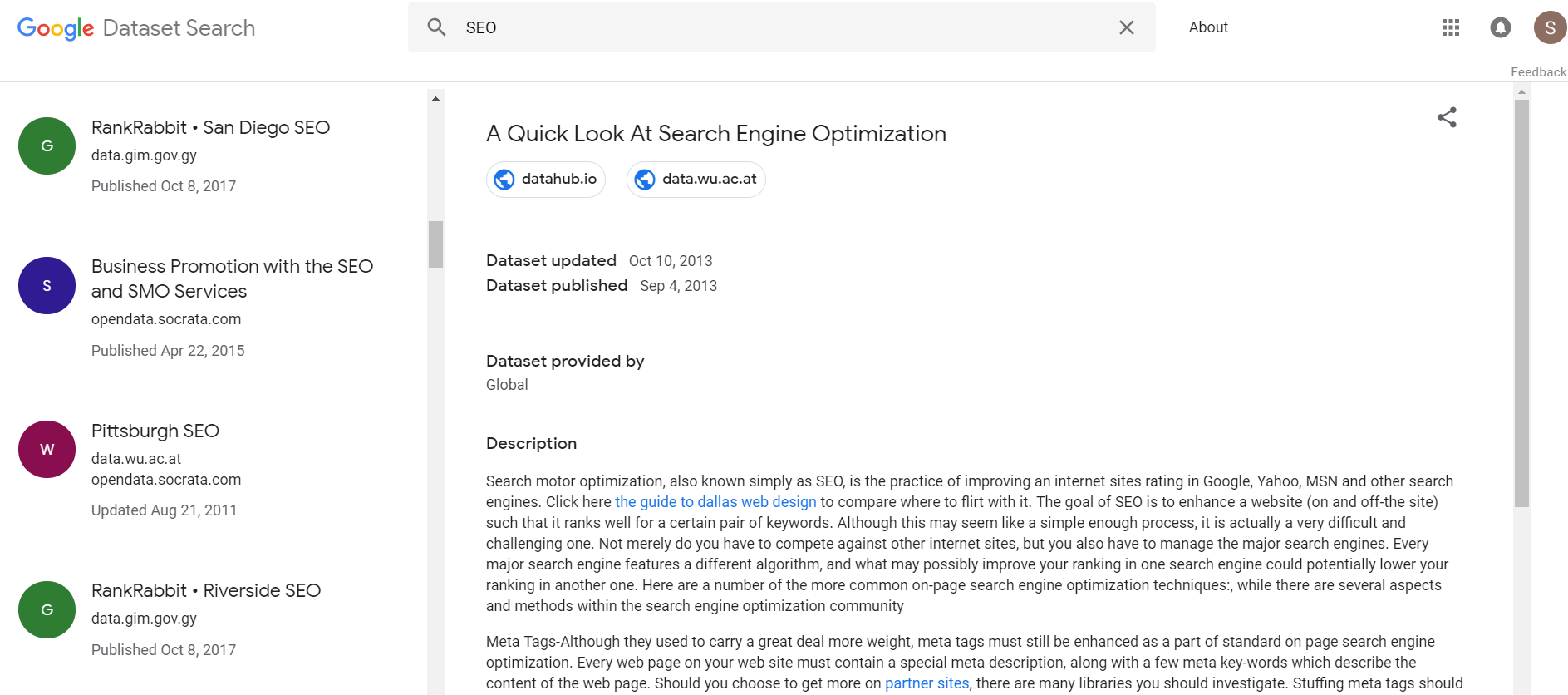 When it comes to SEO analysis and strategy, looking into Google Dataset Search will provide you with some interesting datasets related to SEO. While the number of datasets present is still limited in the beta form, users would still be able to look into valuable data that can prove to be very useful.