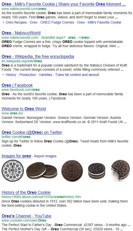Search engines love real social network accounts. And they usually show up in the search engine results page. Just take a look at Oreo’s example: