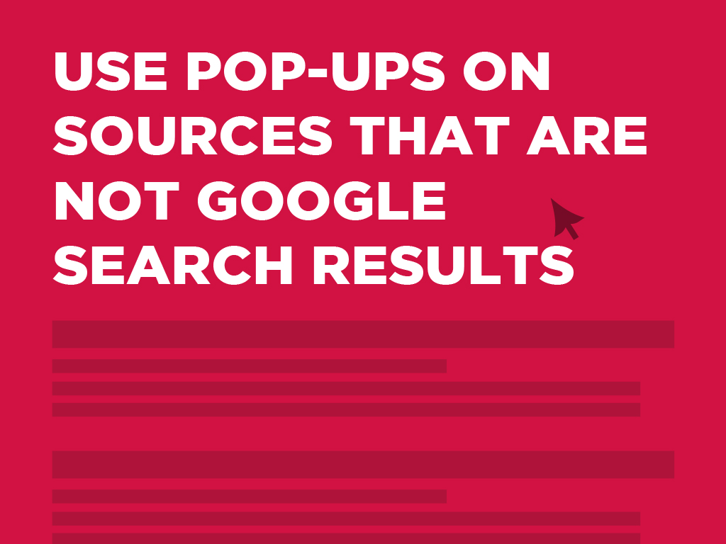Another way in which you can exploit is to put pop-ups in pages that can be accessed through other sources other than from the search results page of Google. This is because Google’s aim is to reduce the pop-ups that show up when you are directed from their results to a certain site’s page.
