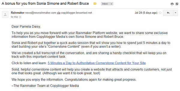 I recently purchased Rainmaker, and I must say that it’s really a good platform. Although I didn’t experience buyer’s remorse since I was more than convinced that it’s worth every penny I spent, Copyblogger offering a bonus after you purchase any of their plans is a good way to build a lasting relationship.
