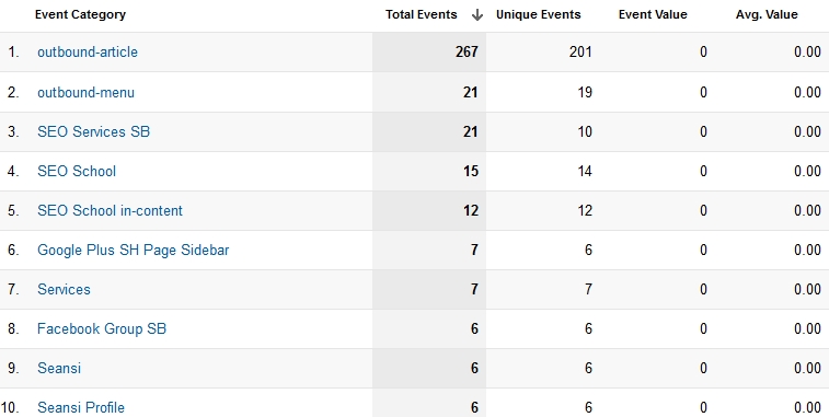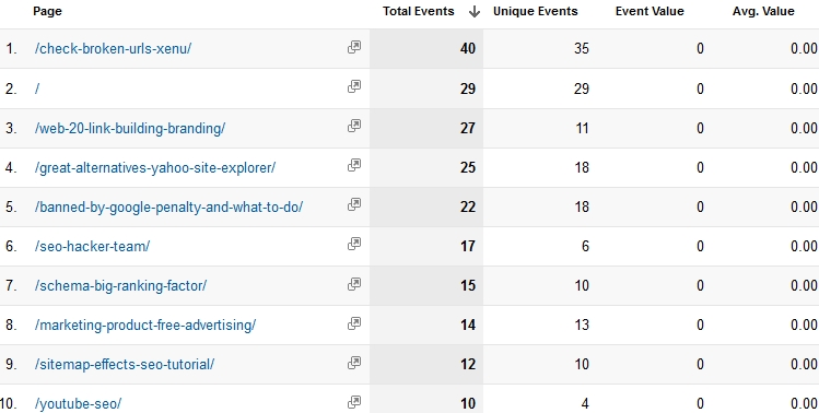 This is how your events would look like in the Top Events section in your Google Analytics. As you can see, most of my events come from outbound links. Tracking outbound links comes with a different code which we will tackle in our Google Analytics Tutorial series.