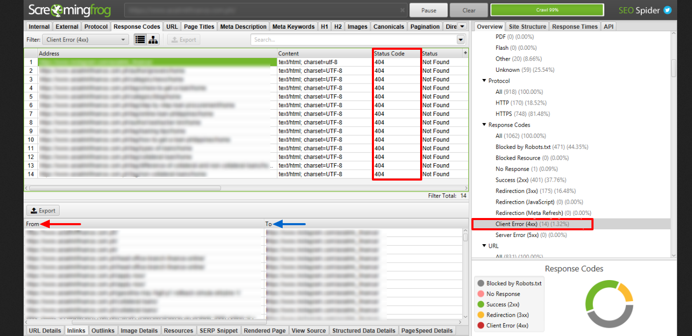 - After the crawl is finished, click on “Client Error (4xx)” on the right sidebar