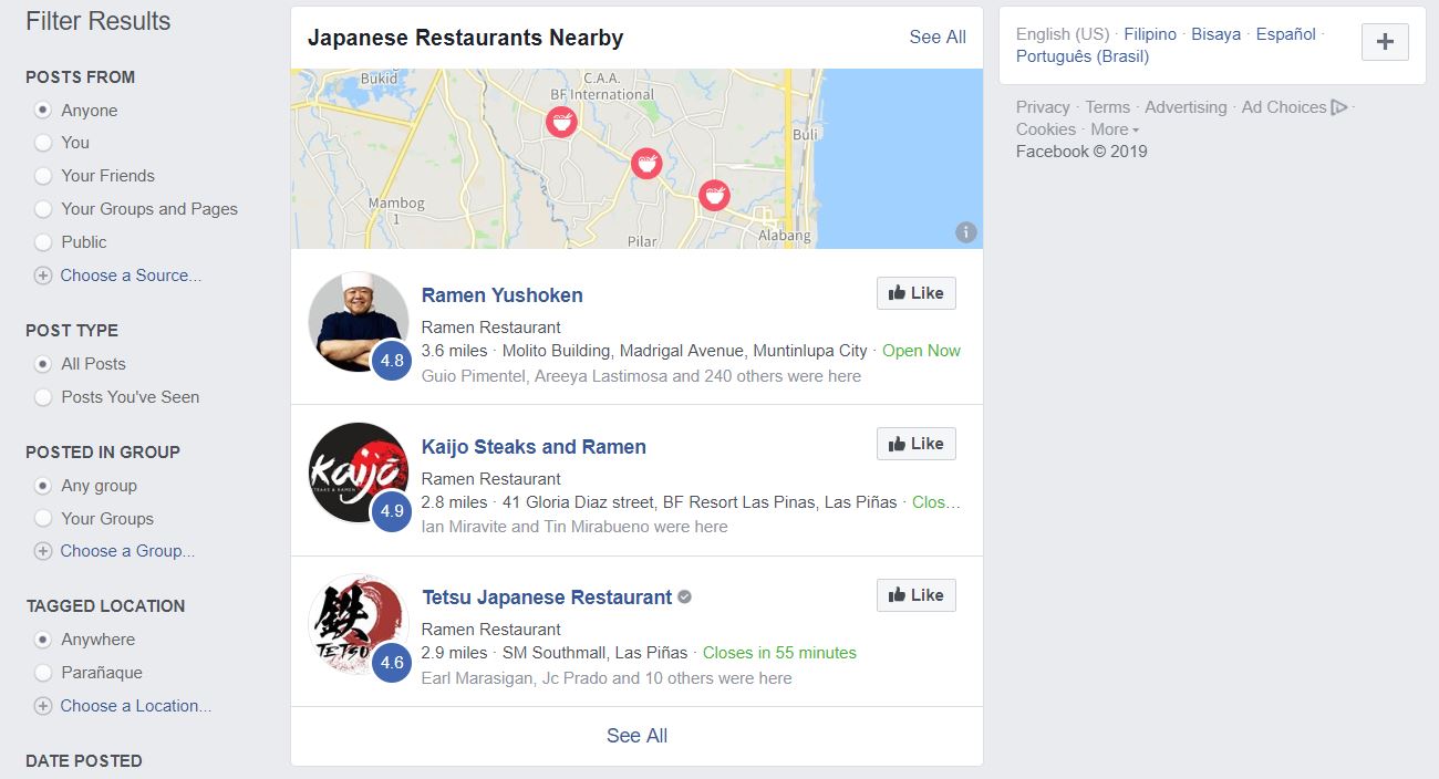 The versatility of Facebook’s search allows you to access so much content, which is why it would help boost your business. Like other search engines, your results would be based on the area that you’re located. Upon checking a few search results, I can see similarities with Google, in a way that local business search results allow me to see maps, photos, and other pieces of content that I might find useful.