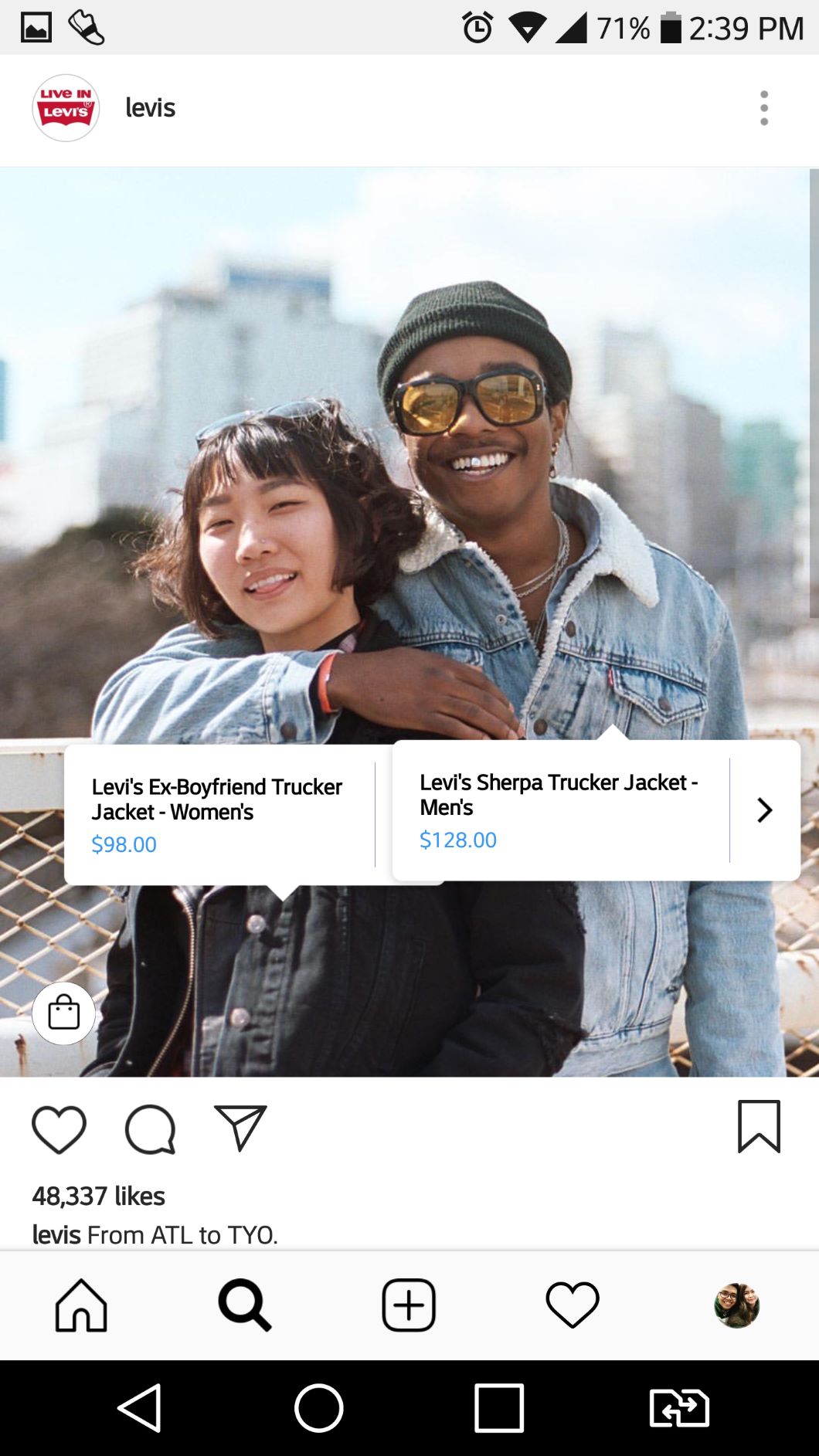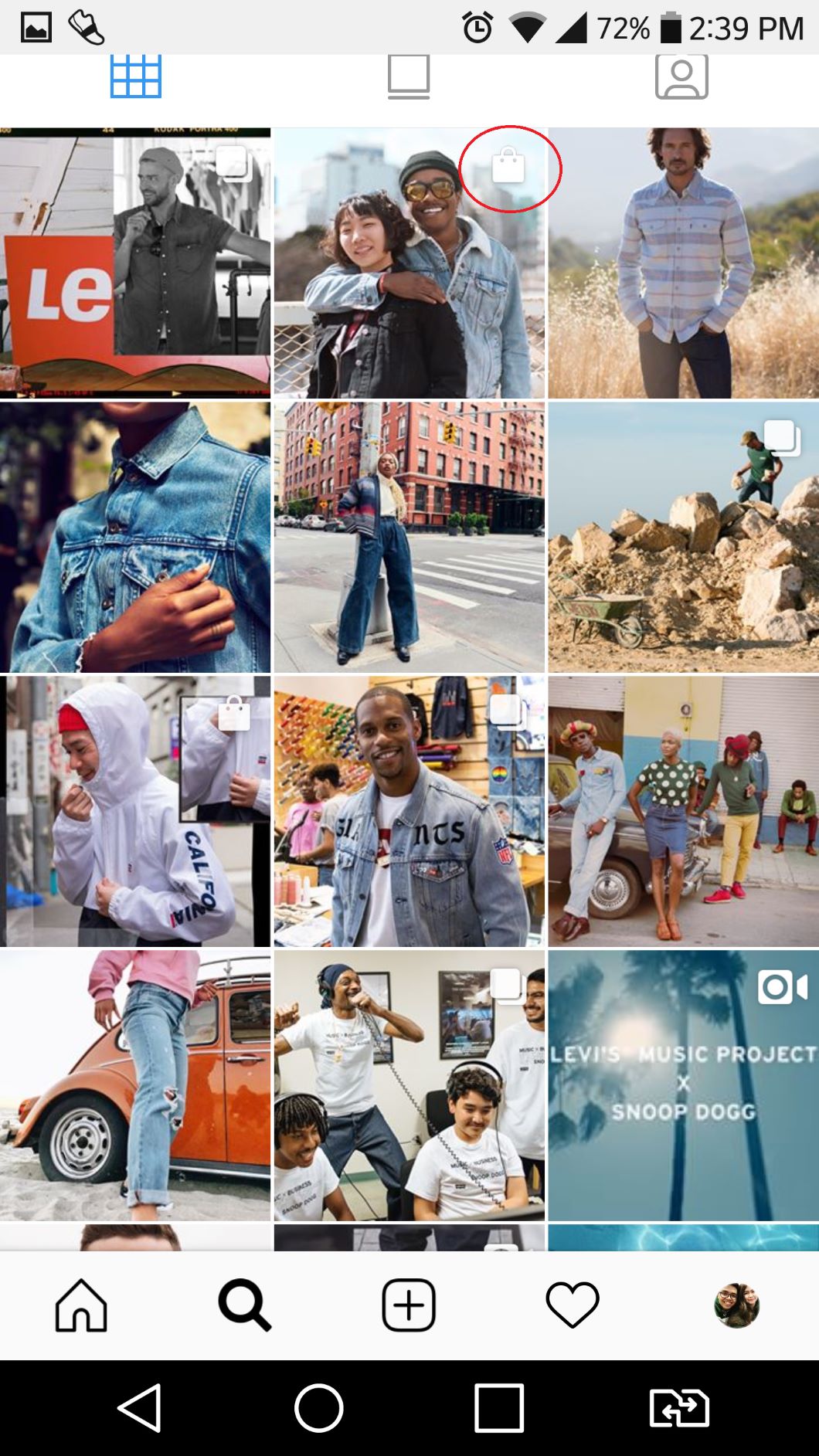 When viewing an Instagram profile of a brand you want to buy, look for images that have a shopping bag icon in the top right corner of the thumbnail image.