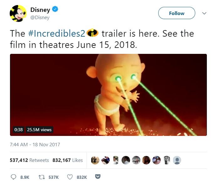 Getting viral on social media begins by promoting your content on the right platform. Currently, the most popular social media platforms include Facebook, Twitter, and Instagram. It is best to know which platform your audience prefers to use regularly and picking the right one would help boost traffic and interactions by a huge amount. For example, when it comes to news and major announcements, Twitter is the best platform to use. As evidenced by this Tweet from Disney announcing an upcoming movie.