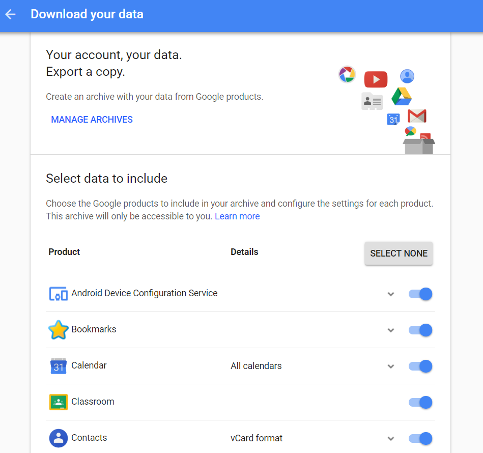 You can select which datasets you would want to download, which includes, Google+, Hangouts, and +1s. Once you have selected the data, you can choose the file type and create the archive. This ensures that your data would not be permanently deleted once it shuts down.
