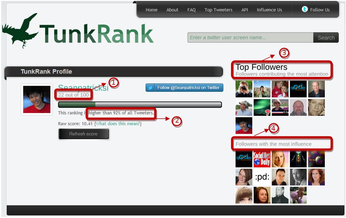 TunkRank has a pretty simple way of telling you solidly how influential you are. They have a 1-100 metric, in which case, 100 is the highest (most influential) and 1 is the lowest (least influential). The rate of influence doubles with every 7 points such as how Google’s PageRank score exponentially increases for every 1 point increase.