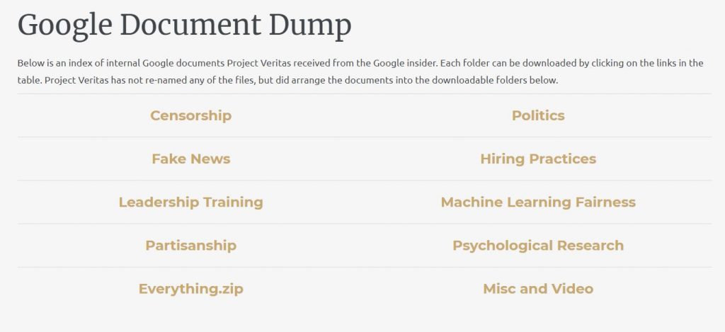 The ‘Google Document Dump’ is a web page that shows 9 folders obtained by the Google insider which can be downloaded and be personally viewed. Note that all information and images presented on this blog post are sourced from Project Veritas.
