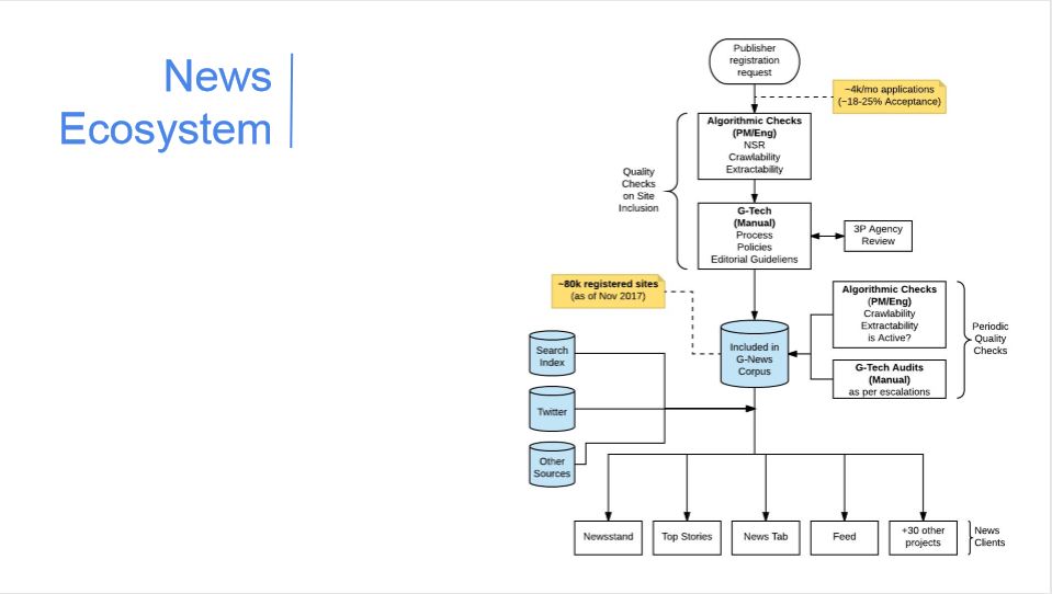 One more notable document from this folder is the diagram of the Google News Ecosystem that shows the process of being verified news publication in the search engine. It indicates that Google receives 4,000 applications a month to be a news publisher but only 18-25% are approved.