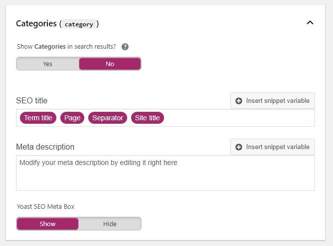 You could also put a noindex tag sitewide for pages such as categories, tags, and author pages so you don’t have to go to every individual page on your website. To put a noindex tag, go to the Yoast plugin itself and then go to Search Appearance. Selecting ‘no’ under ‘Show Categories in Search Results’ would place a noindex tag on all category pages.