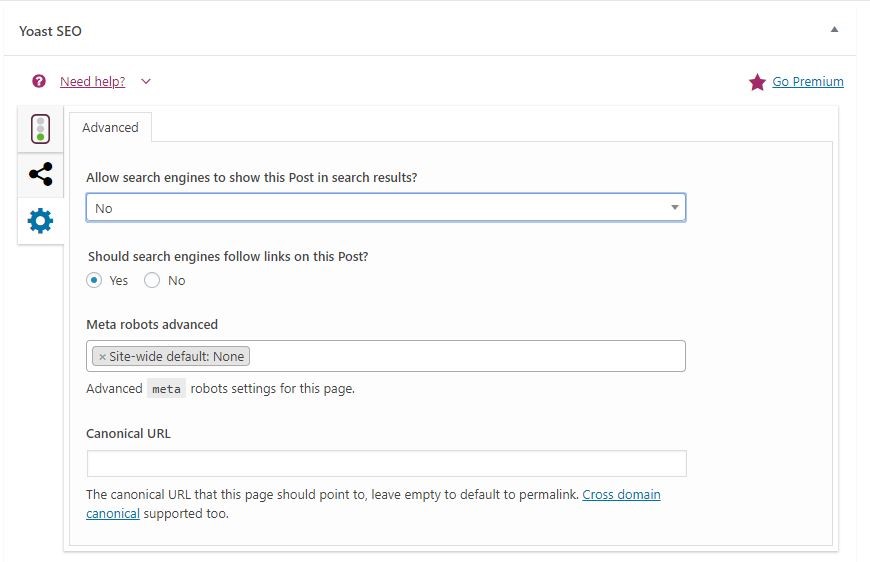 If you’re using YoastSEO in WordPress, there is no need for you to manually place these codes. Just go to the page or post you want to noindex, scroll down to the YoastSEO interface, go to the settings of the post by clicking the gear icon and then select “No” under “Allow Search Engines to Show this Post in Search Results?”