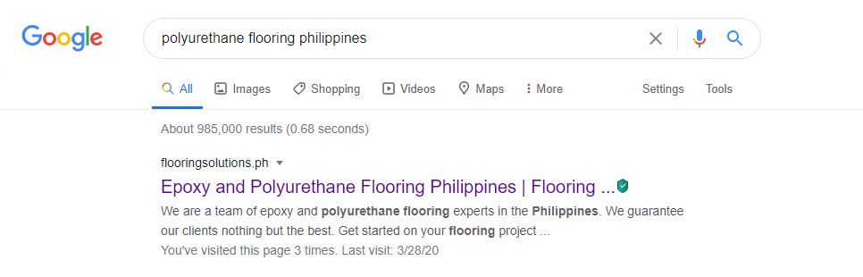One of our clients is offering epoxy and polyurethane flooring here in the Philippines. So I made the title tag of their homepage “Epoxy and Polyurethane Flooring Philippines”. For the keyword polyurethane flooring Philippines, they are actually number 1.