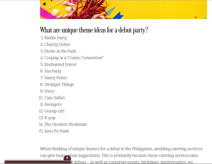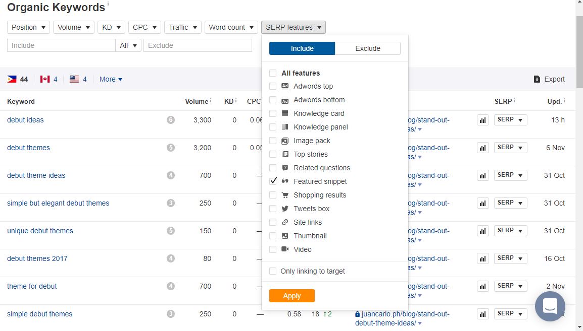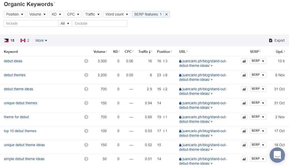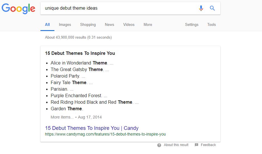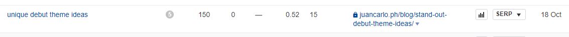 Now that it lists the keywords with featured snippets, select a keyword that you want to optimize for. For this one, we chose “unique debut theme ideas” since it has low difficulty with reasonable volume and the article we wrote is already ranking for it.