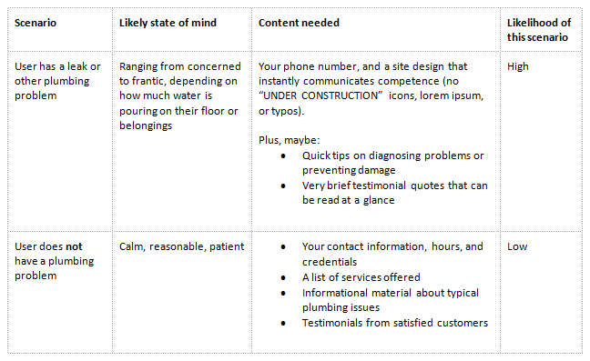 The thing is, your Plumbing website doesn’t have only this kind of user. You also have the user who is just looking for plumbing services because of difficulties that they don’t want to fix themselves. Thus, we can categorize your users into these two types of people as seen in the table below:
