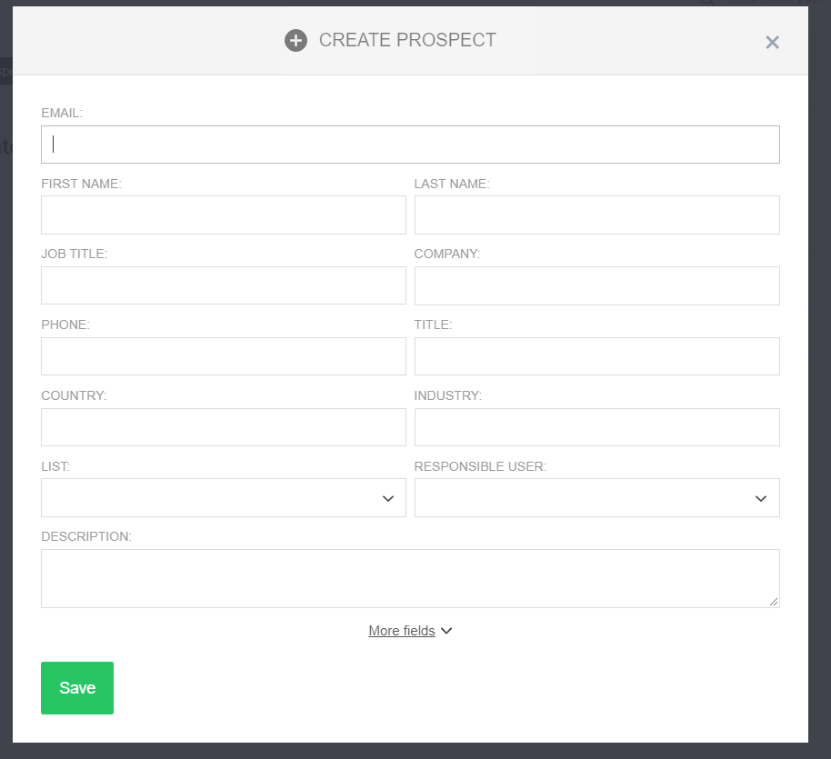 Adding prospects in Prospect.io is simple, as you only need to click on the Create Prospect button (the green plus sign on the top corner). From there, you can add information such as the name of the prospect, company name, industry, phone number, country, and job title, and a short description.