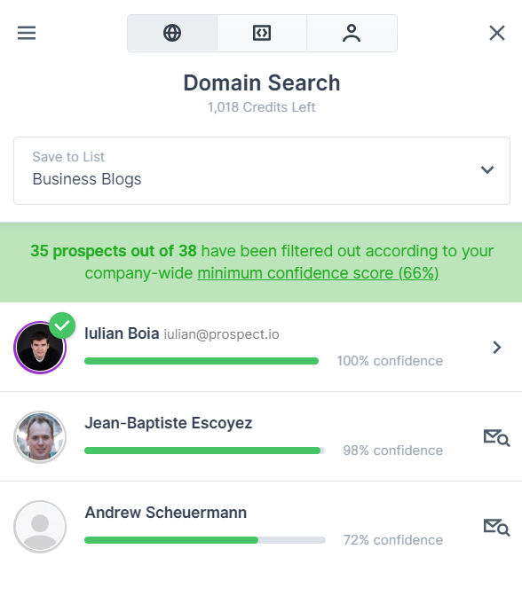 Prospect.io also has a Google Chrome extension, which allows you to search and add prospects while browsing all over the internet. This comes in handy when looking through business listings and company websites, as you can instantly create a list of contacts that you can send articles to.