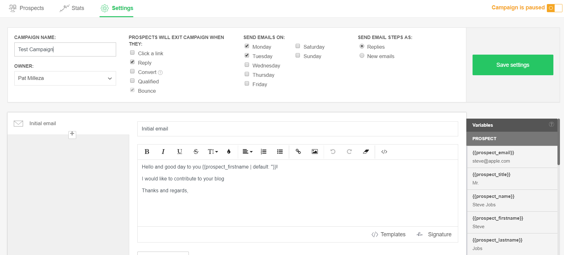 Along with composing your email, you also have the option of selecting options such as when prospects exit your campaign, what days would the emails be sent, and whether or not you want to send the email step as a reply or new email.