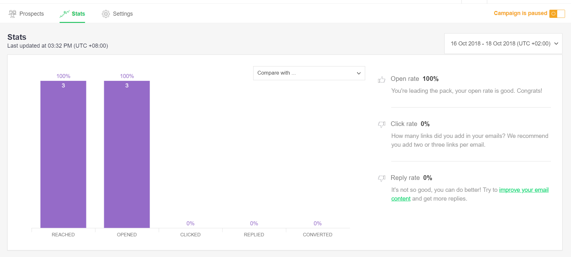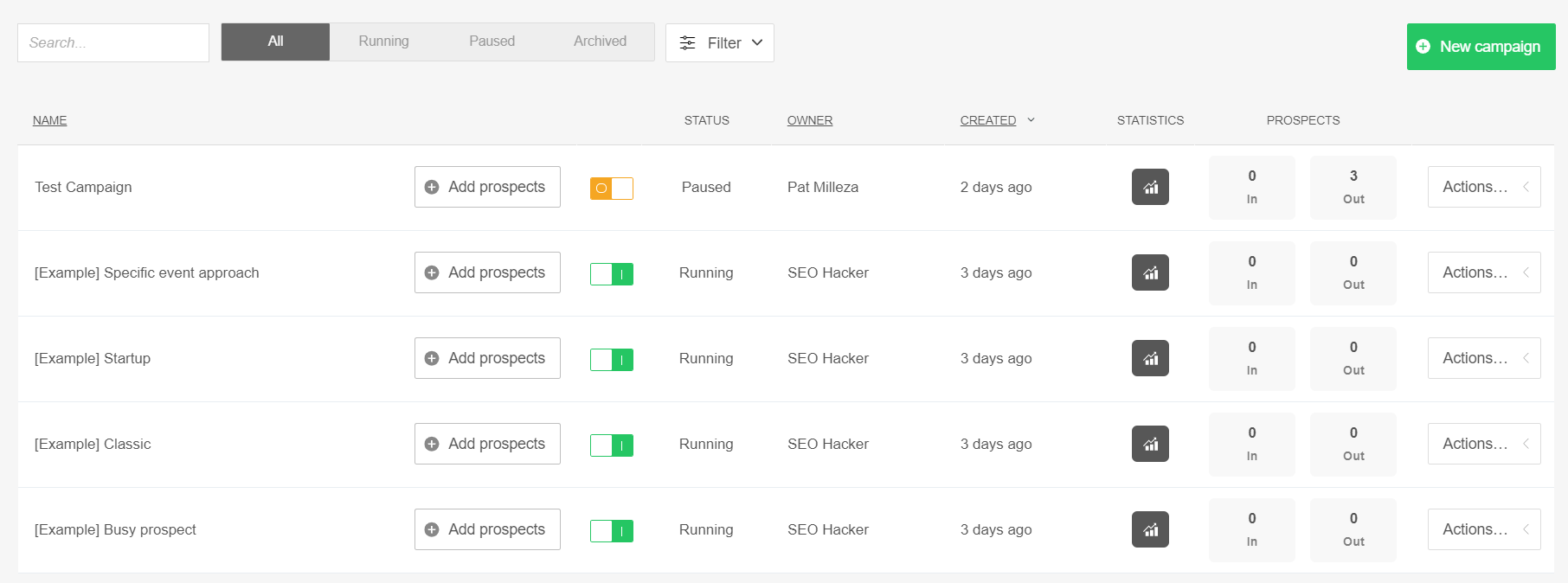 After starting your campaign, you can choose to keep it active or have it paused. You can also view the statistics of the campaign, allowing you to see how many prospects were able to receive and respond to your emails.