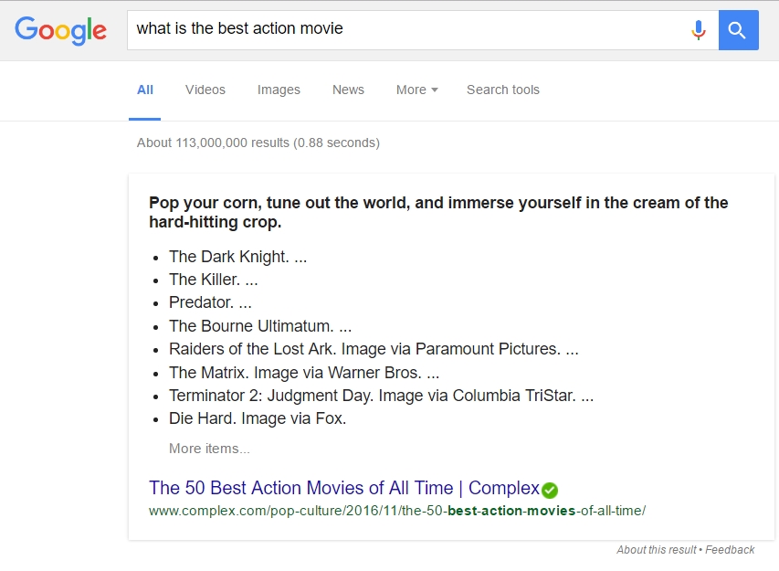 Regardless of the results presented here, what’s really fascinating is how seemingly “smart” the AI really is. What it did here is that in a fraction of a second, the AI sifted through an entire article to render and present a swift listing of what you are looking for. I’ve watched or at least heard of these movies and they are all action movies that have made their target market happy. In a sense, these are all “good” action movies that fit my search terms.