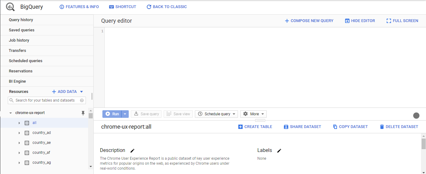The BigQuery Project is a heaven sent for those who would need to analyze big data sets in SQL Queries. This is what the dashboard looks like: