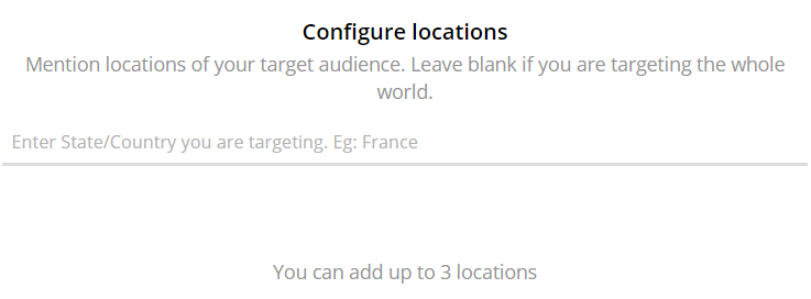 The final step is adding the location of your target audience, this can help provide you a more focused group of people to engage with. You can input up to three locations, and you have the option to target a worldwide audience as well.