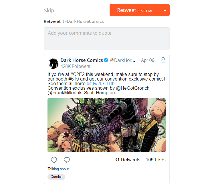 One of the tasks that were assigned to the account is retweeting relevant content. You will be provided a number of relevant tweets that you can retweet. After picking one, all you have to do is to add a comment and retweet away. You have the option of choosing when to retweet, as you can retweet it immediately, or allow Cloohawk to post it at a time where the potential of gaining traffic is high.