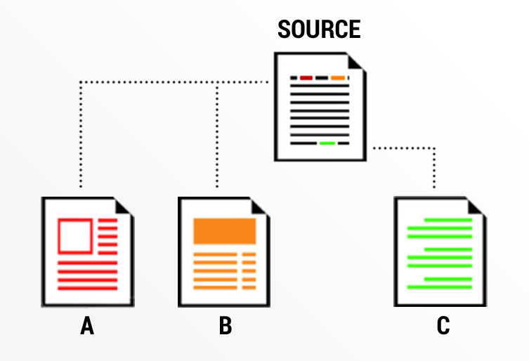 The source site mentions all three sites – A, B and C, which is why all four are related. A and B has a higher relation since they appear closer to each other and may also be more closely related to the source since they are both found in the beginning of the text.