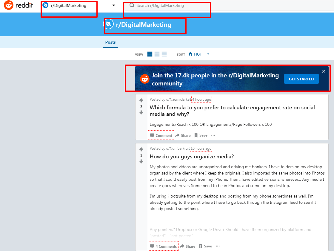 For example, you need to search a specific community related to Digital Marketing. Simply search for a Digital Marketing in the search box on Reddit or you can use the URL as: