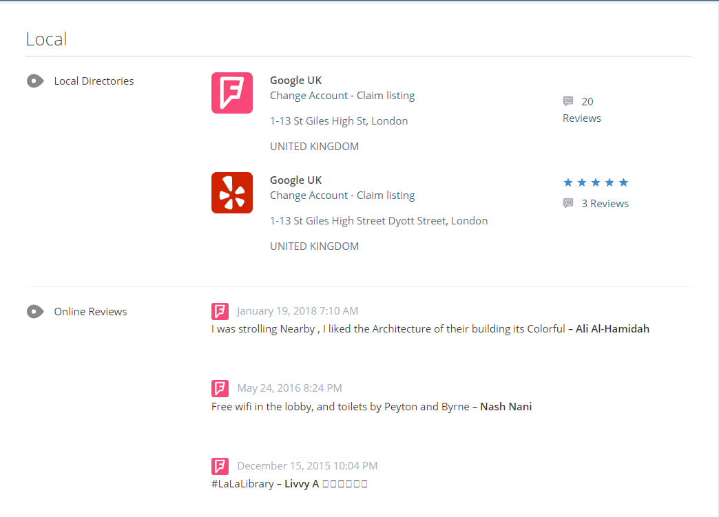 The Local section is to check if your website is listed in any local directories near your area. This can be sites like Yelp and Foursquare, which provide the location, and the ability for users to post reviews. This is essential for local SEO, as it helps make it easier for users to know about your business.